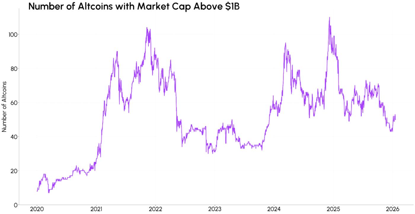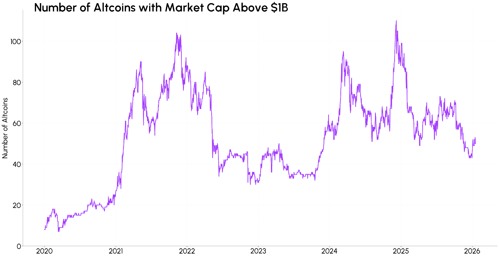 Another way to view this concentration is by looking at the number of tokens crossing certain thresholds. The number of altcoins with market caps above $1B has declined from a peak of ~105 in 2021 to ~58 today, even as total crypto market cap has reached new highs. The pool of “investable” altcoins appears to be shrinking even as the number of assets expand. While this does not bring doom for altcoins as a segment, interest is likely to cluster even more around durable fundamentals and resilience.