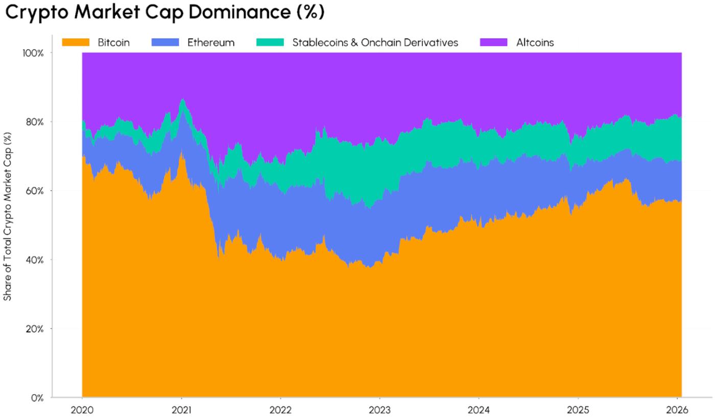 As the crypto investment universe expands, capital is becoming more selective across a smaller set of assets: Bitcoin dominance is in a sustained uptrend, while growth in stablecoins and onchain derivatives compresses the space for the altcoin segment.