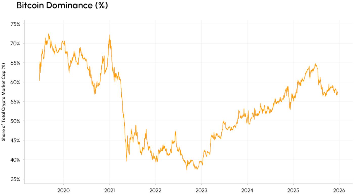 This sustained rise in Bitcoin dominance has been compounded by increased institutionalization through spot ETF access, attracting over $150B in long term capital rather than short term retail flows. This has reinforced Bitcoin’s role as a “safe haven” in crypto markets and a liquid, regulated entry point for traditional allocators, making its dominance a more persistent phenomenon than in past cycles where “altcoin seasons” quickly eroded BTC’s share.