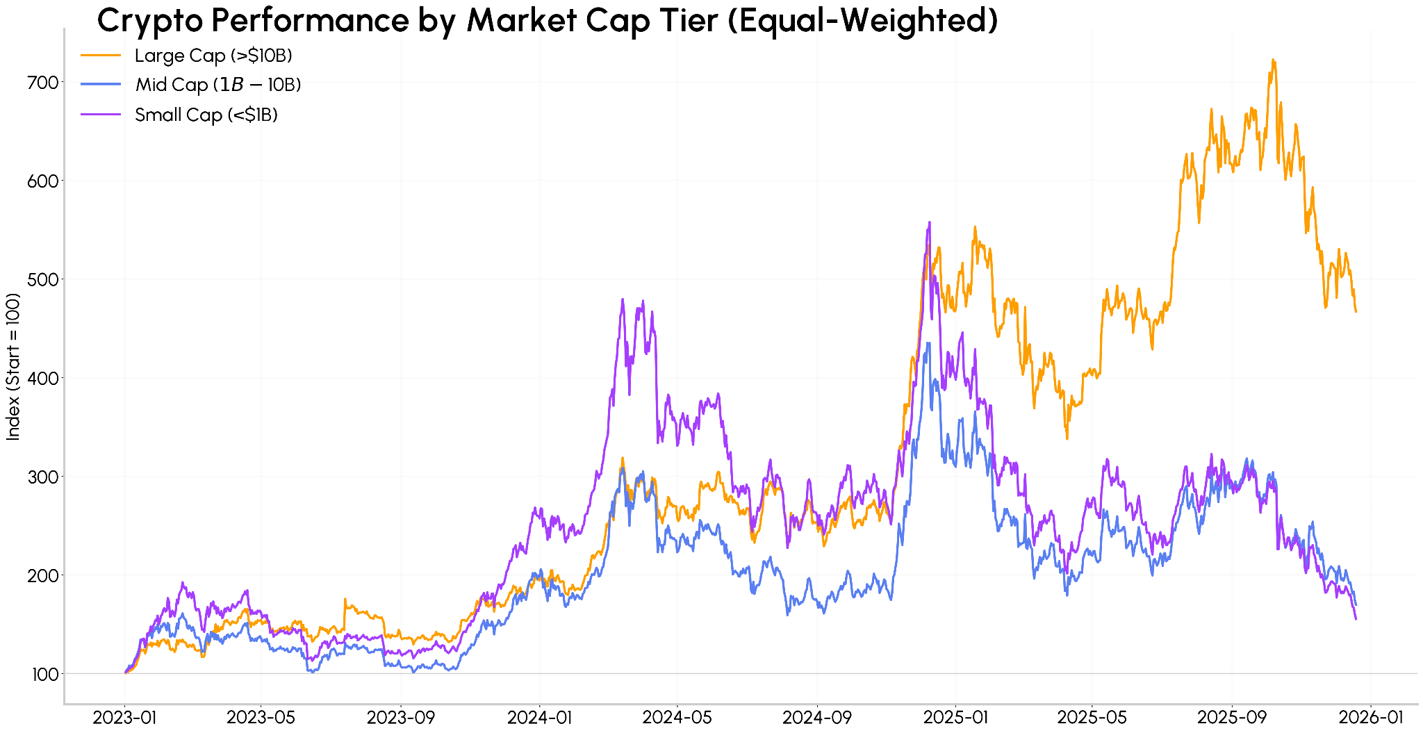 On an equal-weighted basis, large cap assets have returned ~365% since January 2023, while mid caps and small caps have returned ~70% and ~55% respectively, giving back much of their earlier gains. This divergence underscores how performance has increasingly tilted towards established, liquid assets, with gains in smaller tokens failing to sustain in the way previous cycles would suggest.