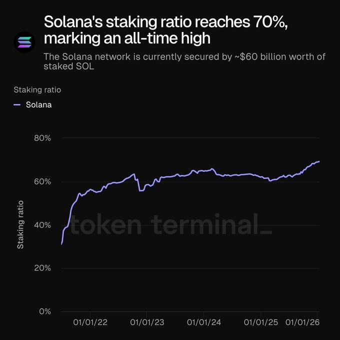 🚨BREAKING: @Solana staking ratio hits a new all-time high of 70%.