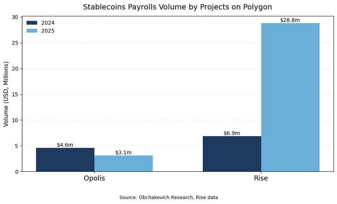 There is great news that Toku has selected @0xPolygon to launch a compliant, global stablecoin payroll for employers. If we look at the analytics, we can see that many interesting companies are already working on Polygon. For example, @rise_pay and @opolis. In 2024, Rise stablecoin payrolls volume reached $6.9M, and in 2025, it reached $28.8M, showing growth of ~317%. The situation with Opolis is slightly different. In 2024, they processed $4.6M in stablecoin payrolls, and in 2025, this amount decreased slightly to $3.1M. Despite the decrease in volume in 2025, growth in December and January (2026) increased relative to other months of 2025. I expect total stablecoin payrolls across all projects to grow by at least 1000%, because in 2026 more and more projects are switching to Polygon payments rails.
