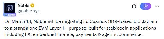 On January 20th, Noble, a Cosmos application chain focused on stablecoins, announced its migration from the Cosmos ecosystem to the independent EVM L1 network. The Noble EVM is scheduled to launch on March 18th, and the team will continue to support Cosmos-based blockchains in the short term. After the migration, Noble's own USDN stablecoin will become a core feature of EVM L1, while the NOBLE token will serve as a governance asset, closely linking protocol decisions and value to stablecoin usage across the network.