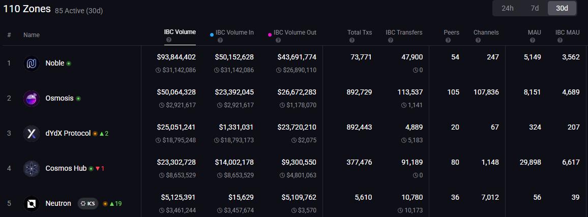Noble is Cosmos's only "superstar." Noble's 30-day IBC trading volume reached a staggering $93.84 million, 1.8 times that of the second-ranked Osmosis ($50.06 million). Among the 110 zones linked to Cosmos IBC, Noble contributes a significant level of liquidity.