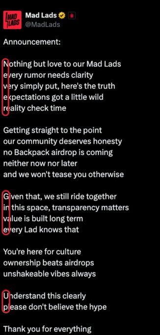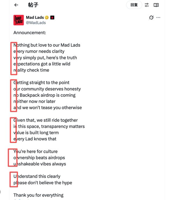 "People come for the culture. Ownership is far more valuable than airdrops. This is the unwavering core spirit of Mad Lads. Please recognize this. Do not easily believe external hype."