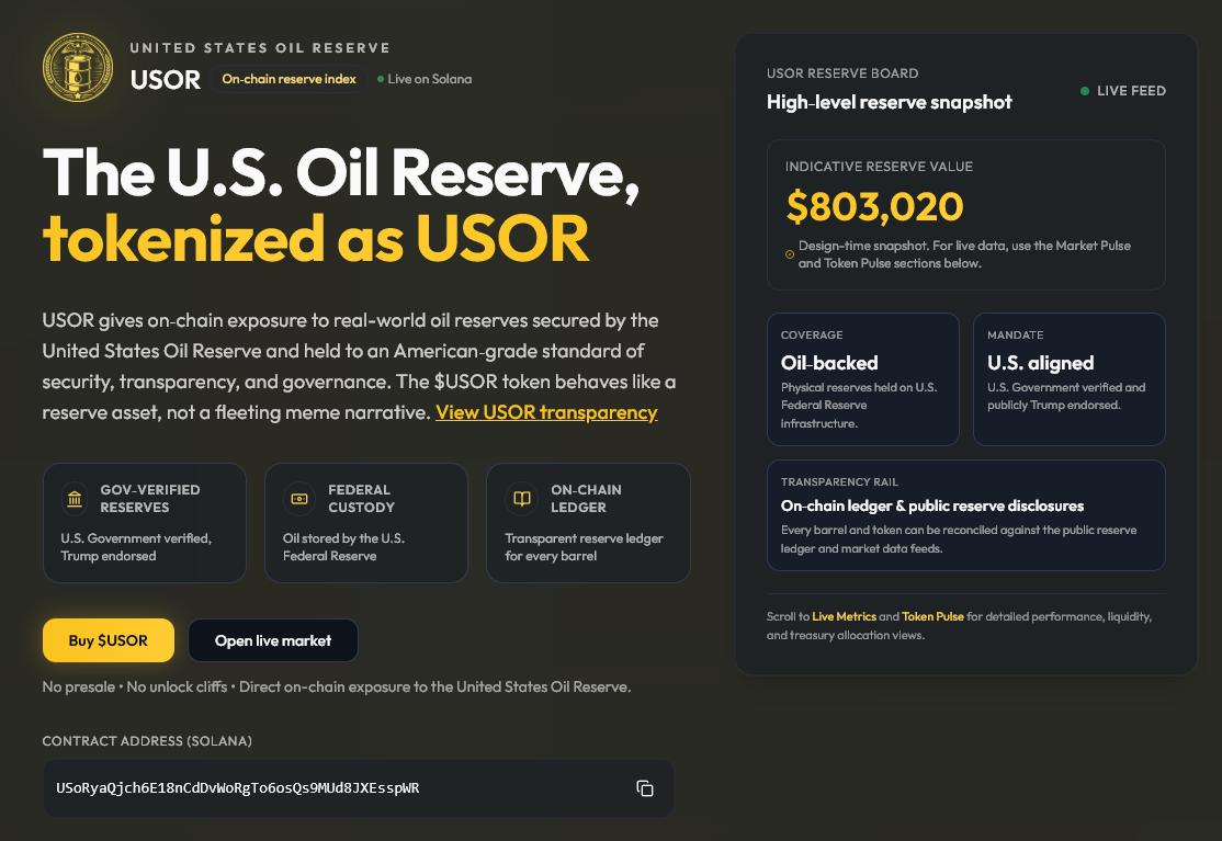 The project's website states that USOR represents an " on-chain reserve index," Tokenize U.S. oil reserves, presenting itself as oil-backed, U.S.-oriented, and operating transparently and publicly.