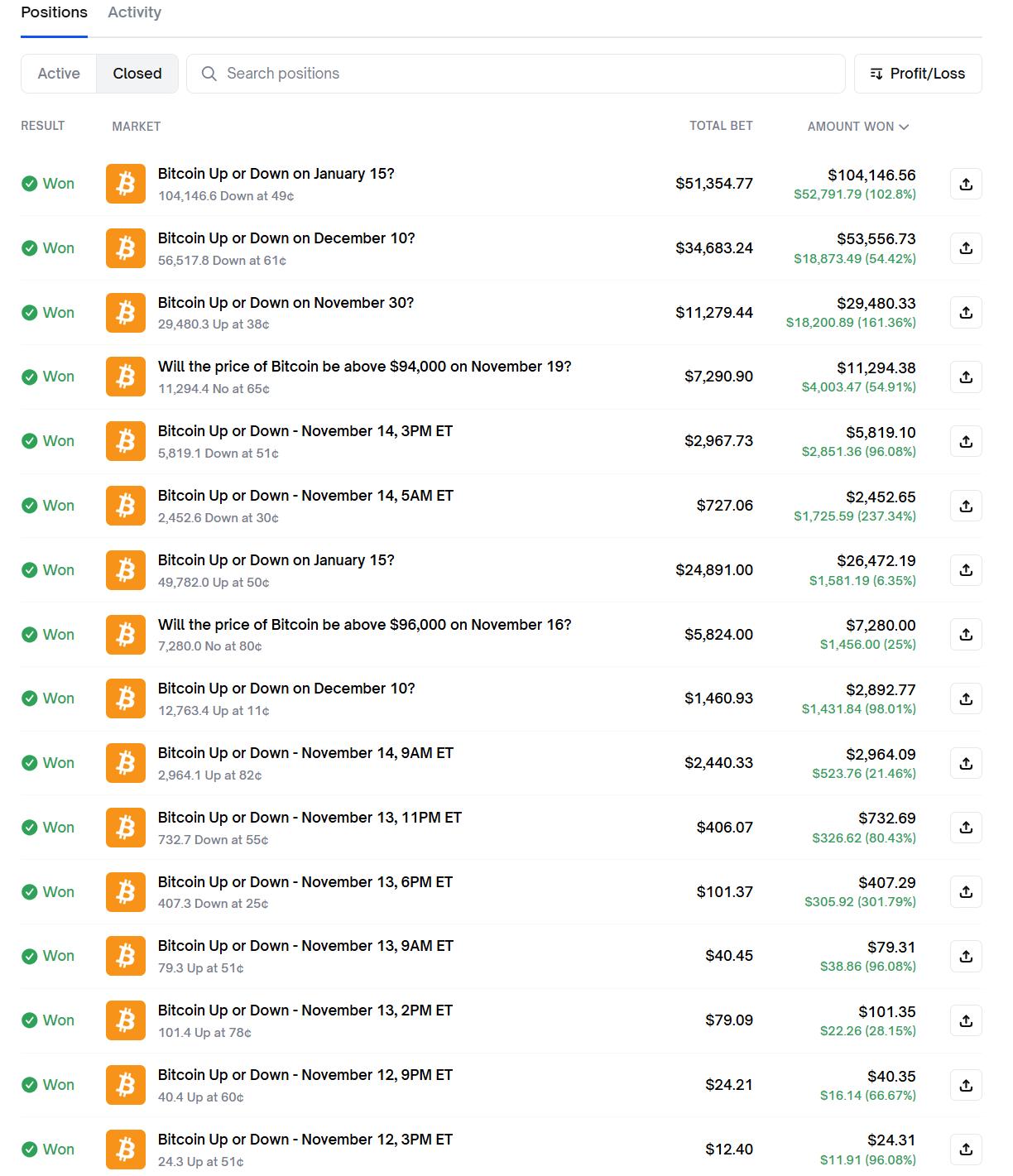 This player correctly predicted the short-term trend of BTC 16 times, earning $100,000.