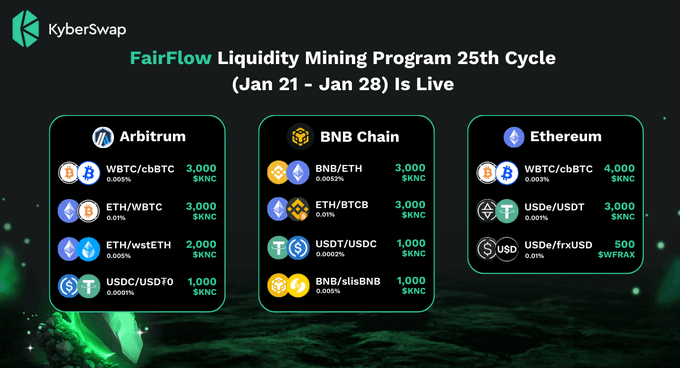 Mining period from Jan 21 - Jan 28, available on Ethereum, BNB Chain, Arbitrum and Base with 24,000 $KNC and other rewards.
