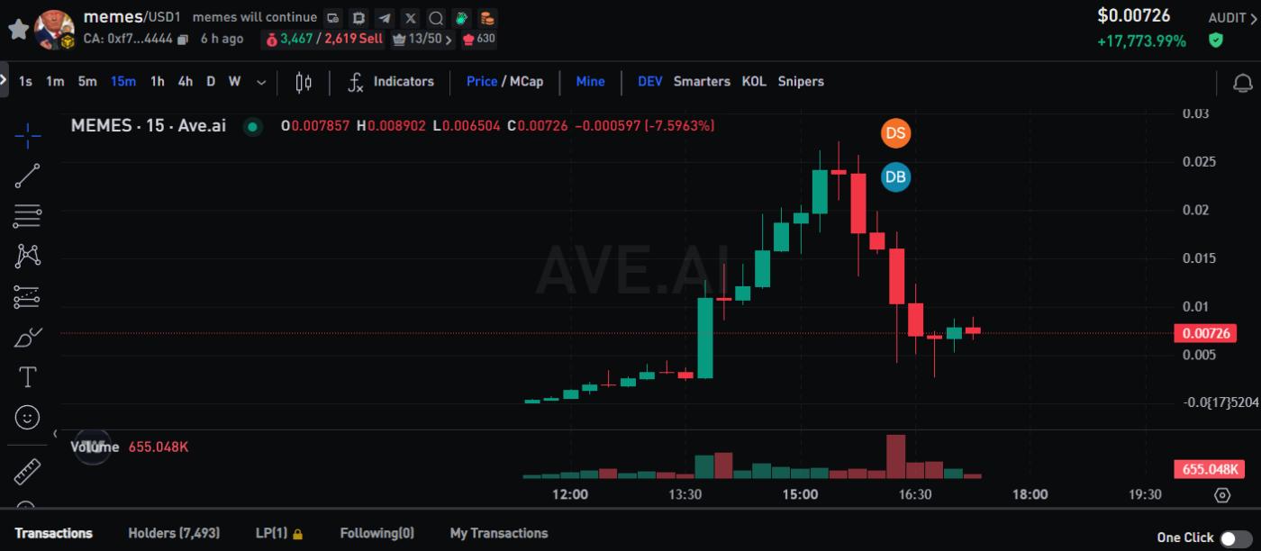 According to GMGN monitoring, MEMES experienced a sharp “wick down” to roughly $14.29 million in market value during a brief liquidity vacuum, before rebounding above $18 million, a sequence that illustrates how meme markets often oscillate between euphoria and fragility within minutes, especially when price discovery is driven less by fundamentals and more by reflexive trading behavior amplified by social cues.