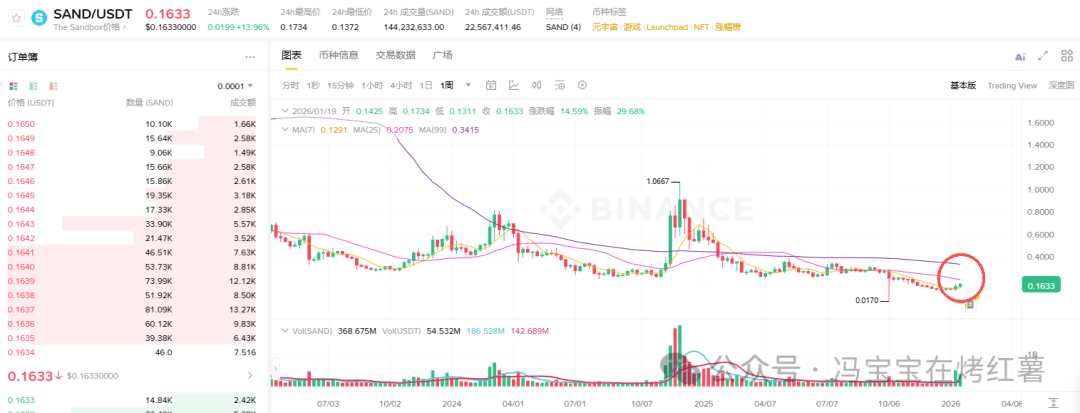 Speaking of Sand, there's been some positive news recently, and both the monthly and weekly charts show a bottom. If this pattern were a mainstream coin, it would definitely surge. However, mainstream coins aren't performing well right now, so it's uncertain whether altcoins can experience a rally.