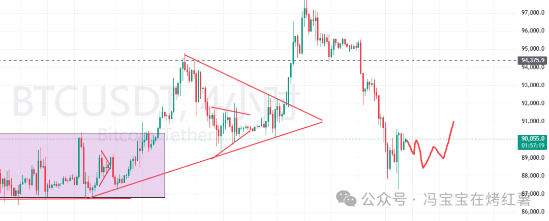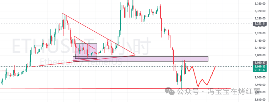 However, the rebound on the 1-hour chart is weak, and there's a high probability of another downward move, a minor double bottom test, with a target range of 2930-2900. The plan is to enter long positions within this range, with a stop-loss based on the low of the overnight dip. If the prediction is correct, it could yield two to three hundred points, which is worth a try!
