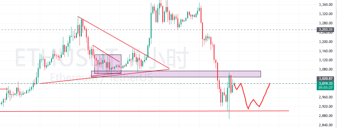 However, the rebound on the 1-hour chart is somewhat weak, and there's a high probability of another drop, which could be considered a minor double bottom. Target order prices can be placed in the 2900-2930 range, with stop-loss orders set based on the low of the overnight price spike. If you can successfully enter the market, you could potentially earn around 200-300 points, making it worth a try.