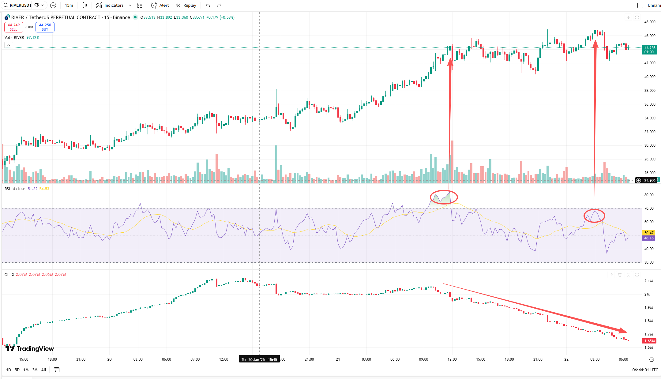 The price of $RIVER keeps hitting new highs, but open interest is clearly decreasing. Last night's new high was most likely not driven by new long positions, but rather by short sellers who couldn't withstand the pressure and liquidated their positions. I think the major players aren't as aggressive at this price level anymore; after repeatedly squeezing shorts, they probably want to take a break. But some people are stubbornly holding onto a -4366% funding rate, essentially handing money over to the big players.