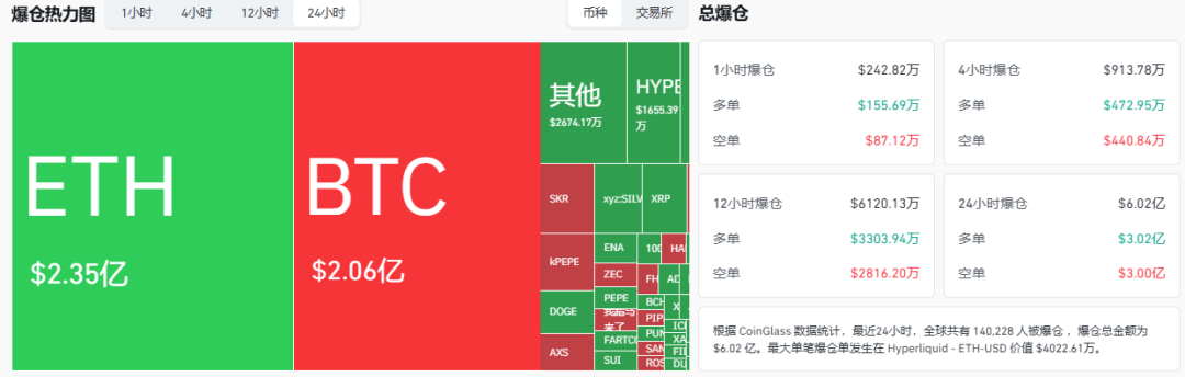 In the past 24 hours, a total of 140,228 people across the internet have been liquidated, with a total of $602 million. Among them, long positions suffered a bloodbath ($302 million), and short positions were not spared either ($300 million).