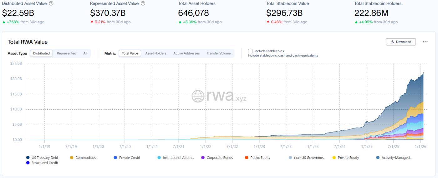 According to the latest data disclosed by RWA.xyz, as of January 23, 2026, the total market value of RWA on the chain reached US$22.59 billion, an increase of 7.58% compared to the same period last month, showing steady growth; the total number of asset holders increased to approximately 646,100, an increase of 8.36% compared to the same period last month.