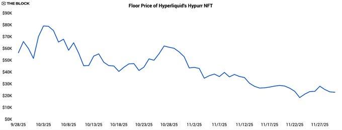 Hypurr was distributed to Hyperliquid community members according to eligibility rules, designed to reward users who actively participated in trading before the platform token's official launch in November 2024. In the secondary market, its initial floor price exceeded $55,000, with an all-time high of approximately $79,000, before gradually declining to around $28,000.