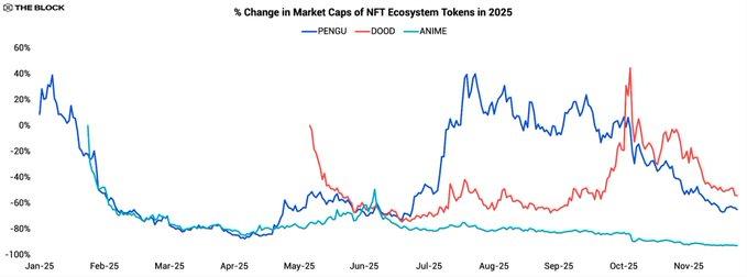 Azuki's token ANIME stands out for its near-absence of any rebound. It fell shortly after its launch in late January 2025 and, unlike PENGU or DOOD, never experienced a meaningful upward trend. Its price steadily declined throughout the year, currently down over 90%, making it the worst-performing token in the three major NFT ecosystems. The market's general fatigue with "cultural coins" seems to have completely overshadowed the initial curiosity.