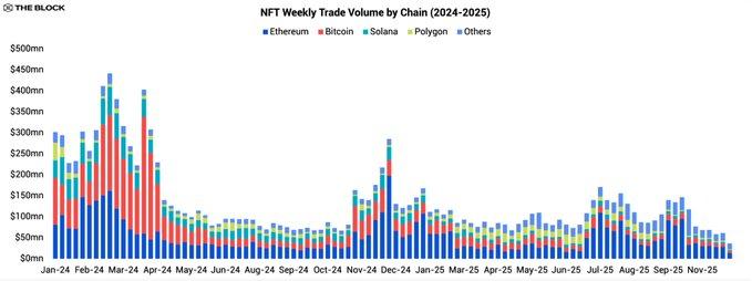 Despite the slowdown, venture capital continues to fund NFT and GameFi projects, but annual funding in the sector in 2025 was only around $1 billion, a decrease of about 65% from 2024. Meanwhile, the total market capitalization of NFT/game tokens fell by more than 60% during the year, reflecting both price declines and the poor performance of many launched projects.