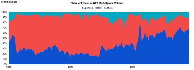 Taking OpenSea as an example, the most obvious change is reflected in the reversal of its market share in Ethereum NFTs. After relinquishing the top spot to Blur for about three years, OpenSea regained the number one position in 2025 and significantly widened its lead throughout the year.