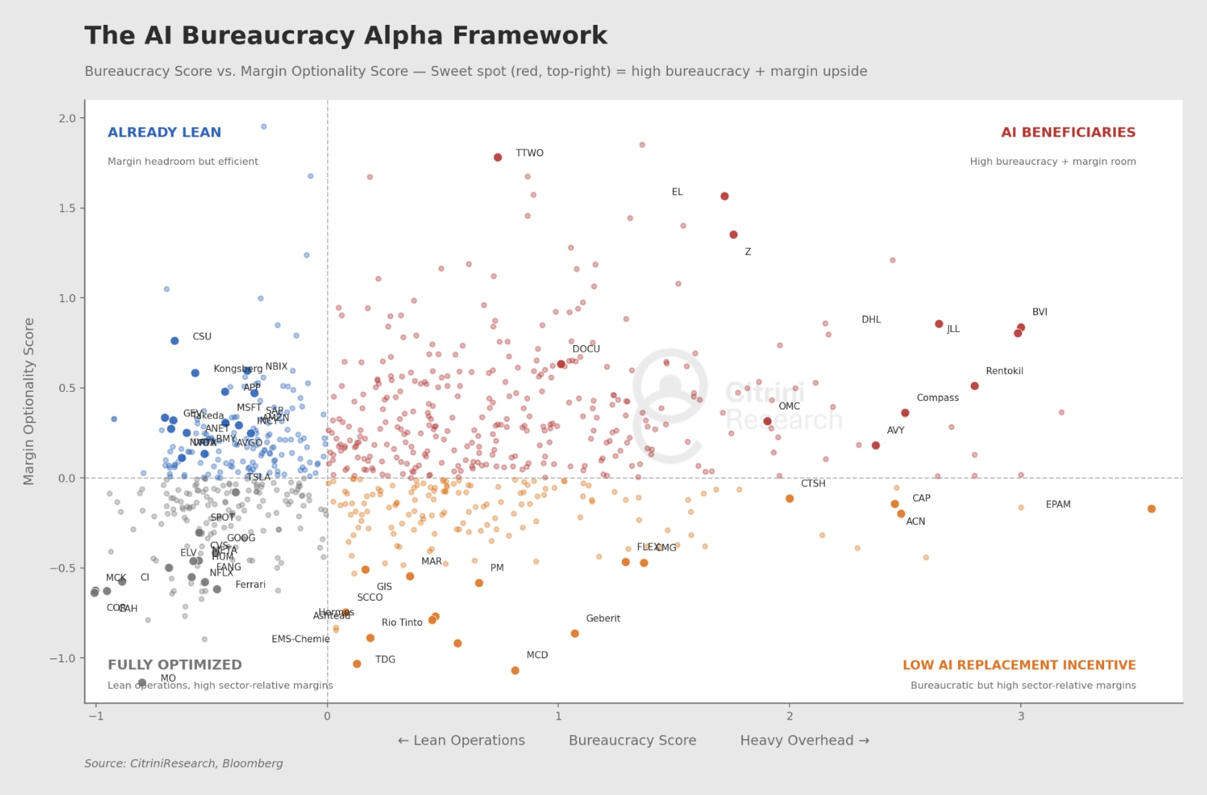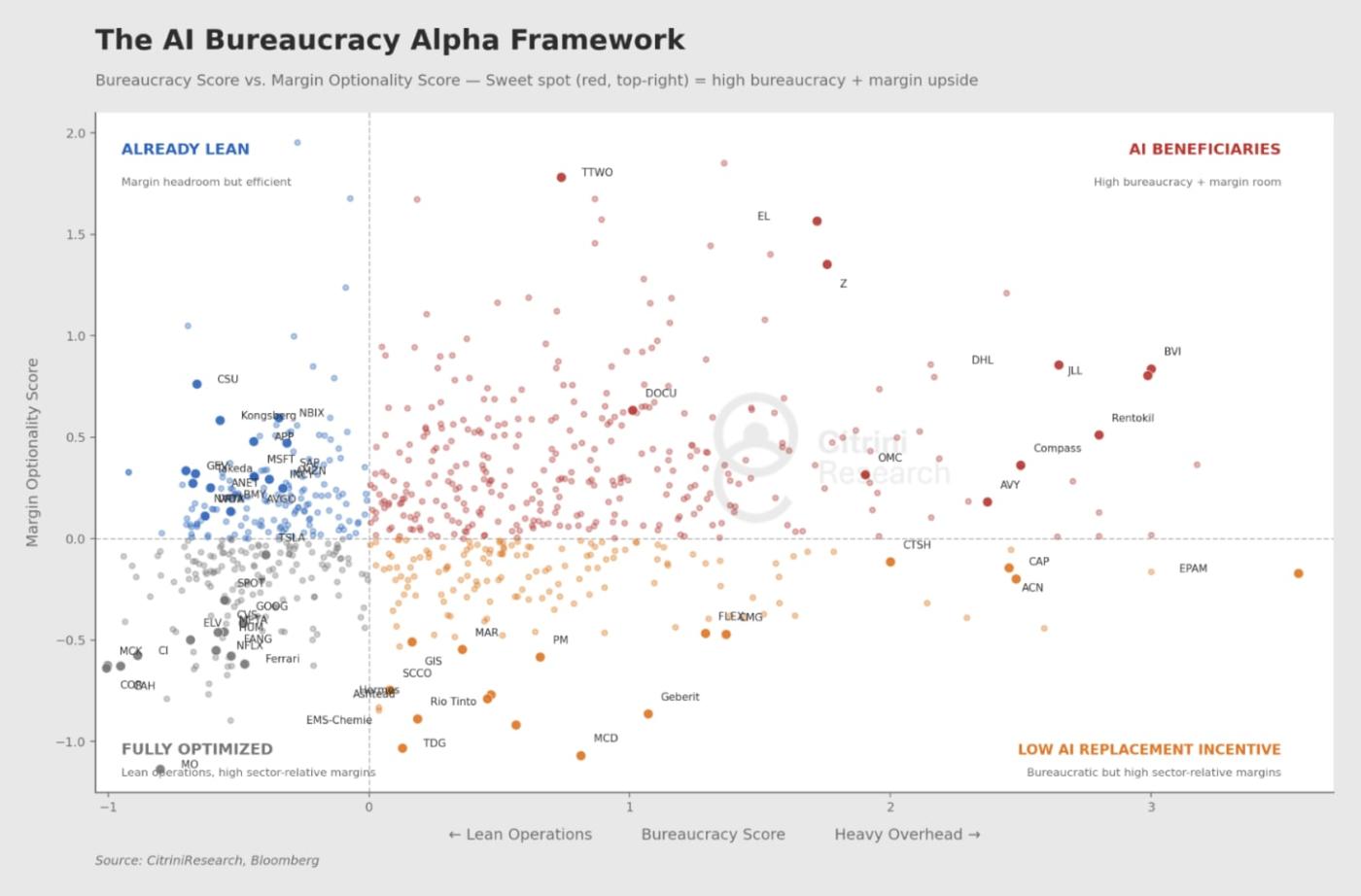 They examined large, expensive organizations in high-wage economies generating less net income per employee relative to industry peers, measuring bureaucracy (via overhead ratios, headcount per dollar of net income) and assigning each a sector-specific z-score. The result was set against their margin optionality scores they computed - ability to improve margins if headcount is reduced - and the final result looks like this: