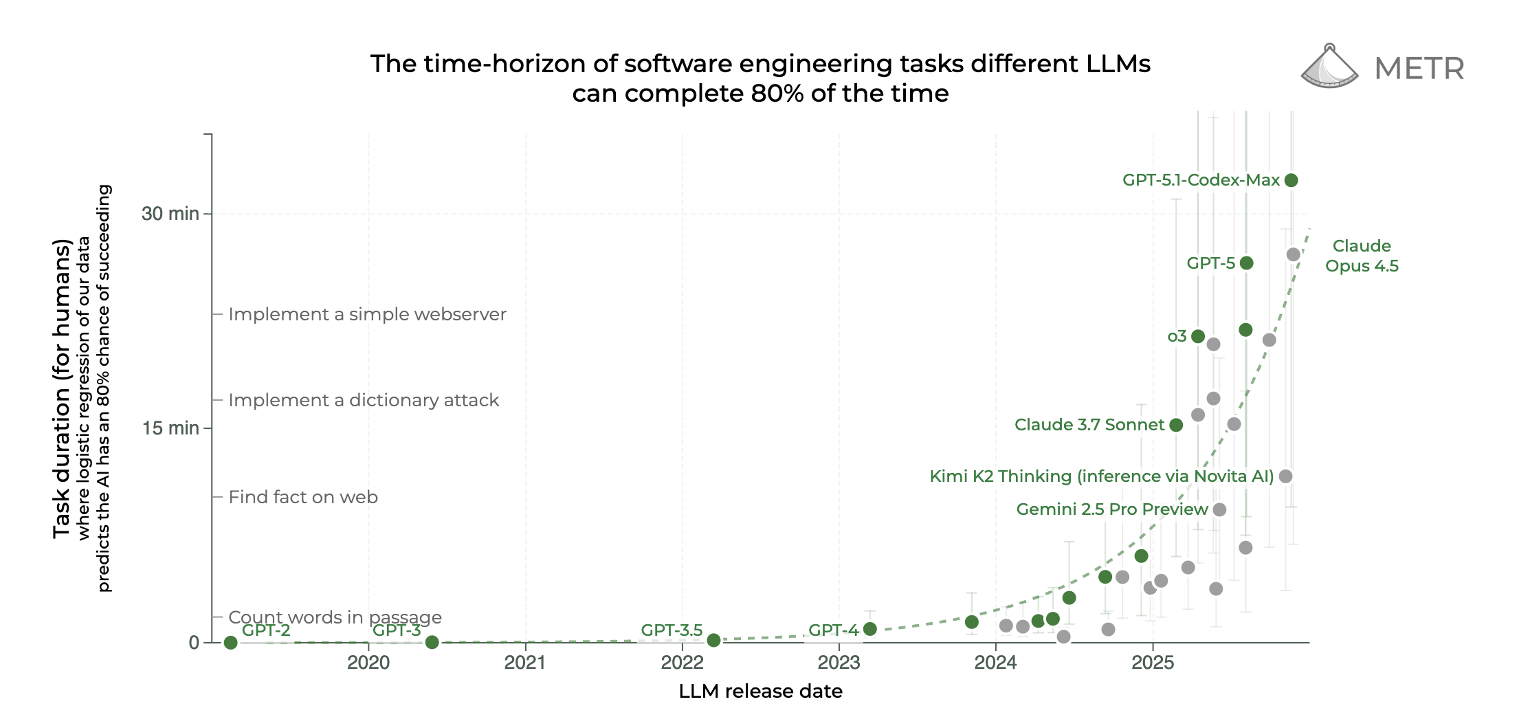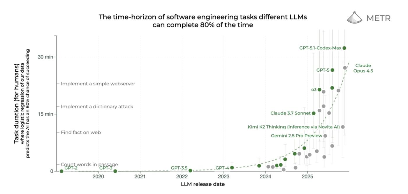 If you previously assumed frontier LLMs were comparable to a new grad, or maybe PHD student, your assumptions would be incorrect given LLMs performing at the level of a 14-year veteran with a nearly 50% success rate. This rate of progress leads me to believe the barrier of scaling raw intelligence will be broken and give way to a new barrier - implementation of intelligence - or how well a lab can apply its models to the real world.