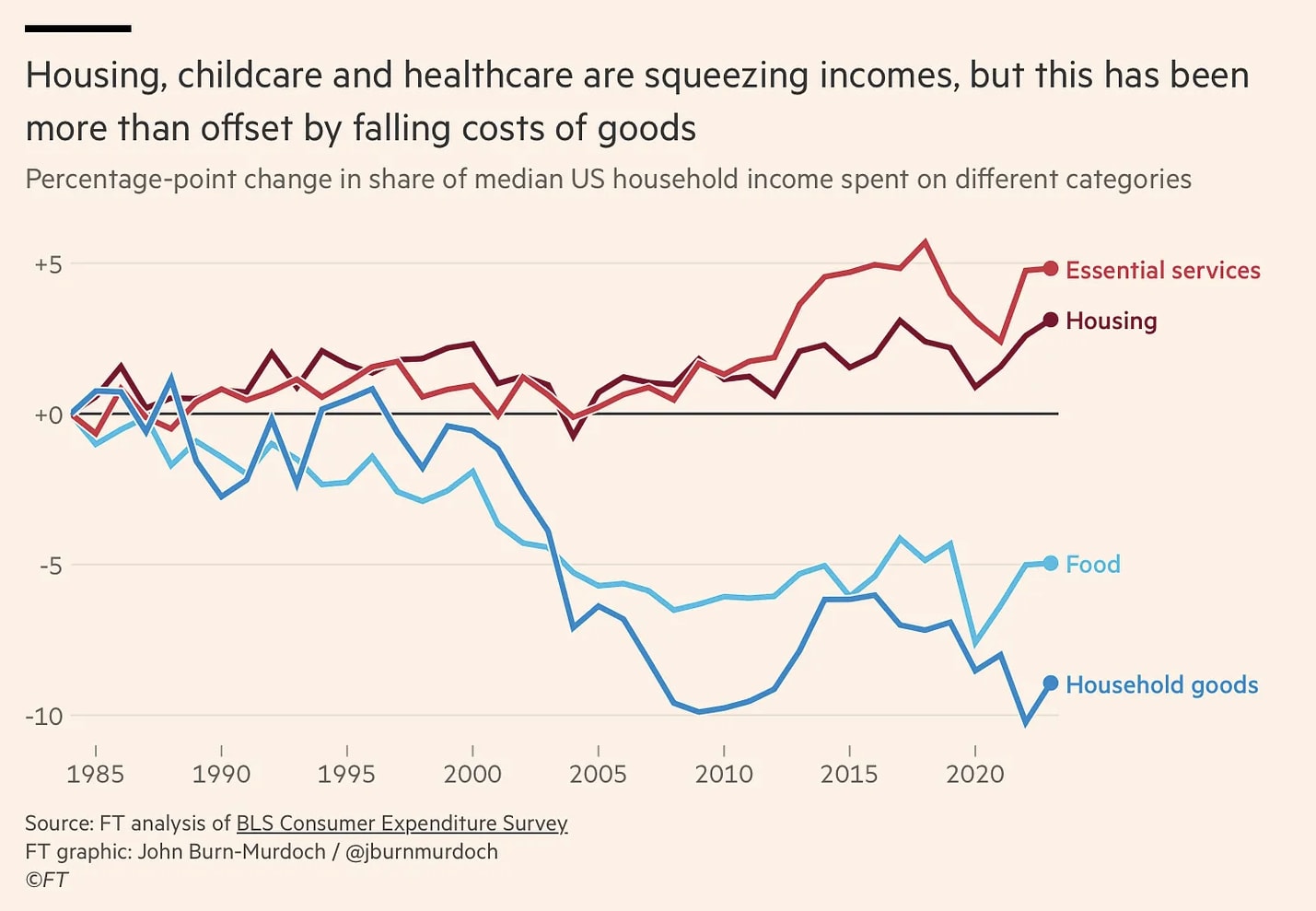 “In practice, that means the core ingredients of a middle-class life like housing, healthcare, childcare, education, eldercare are all Baumol sectors. They’re getting more expensive faster than wages grow. You can “do everything right” and still feel underwater.”