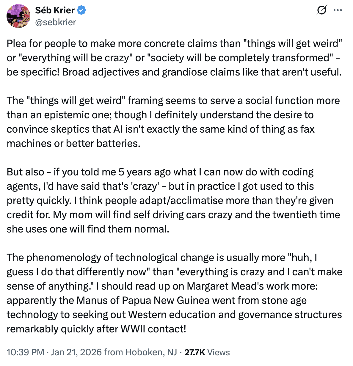 Despite everything, the normal technology perspective isn’t an easy view to hold, especially considering the justifications needed to support this every time you see things like Anthropic discussing its very normal technology, Claude: