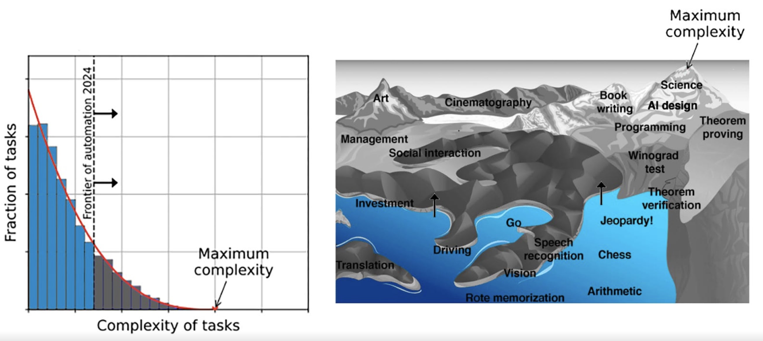 Moravec’s landscape of human competences is a good crutch for visualizing the difference amongst tasks, mainly given the difficulty we’d have in quantifying the amount of depth required of a top cinematographer relative to a top brain surgeon; both are difficult jobs, yet demand an entirely differentiated set of skillsets from its practitioners.