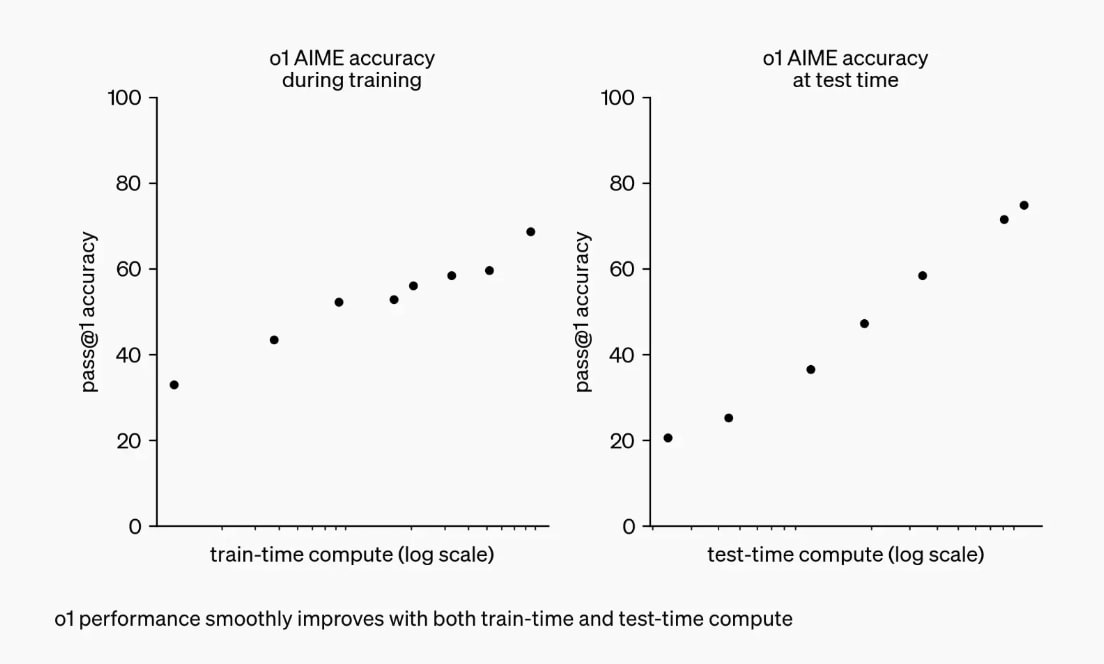 As Toby highlights, RL-scaling has been applicable since the release of GPT o1, where OpenAI showcased a chart of train-time v. test-time compute, showcasing the effects on model performance upon scaling up each of these.