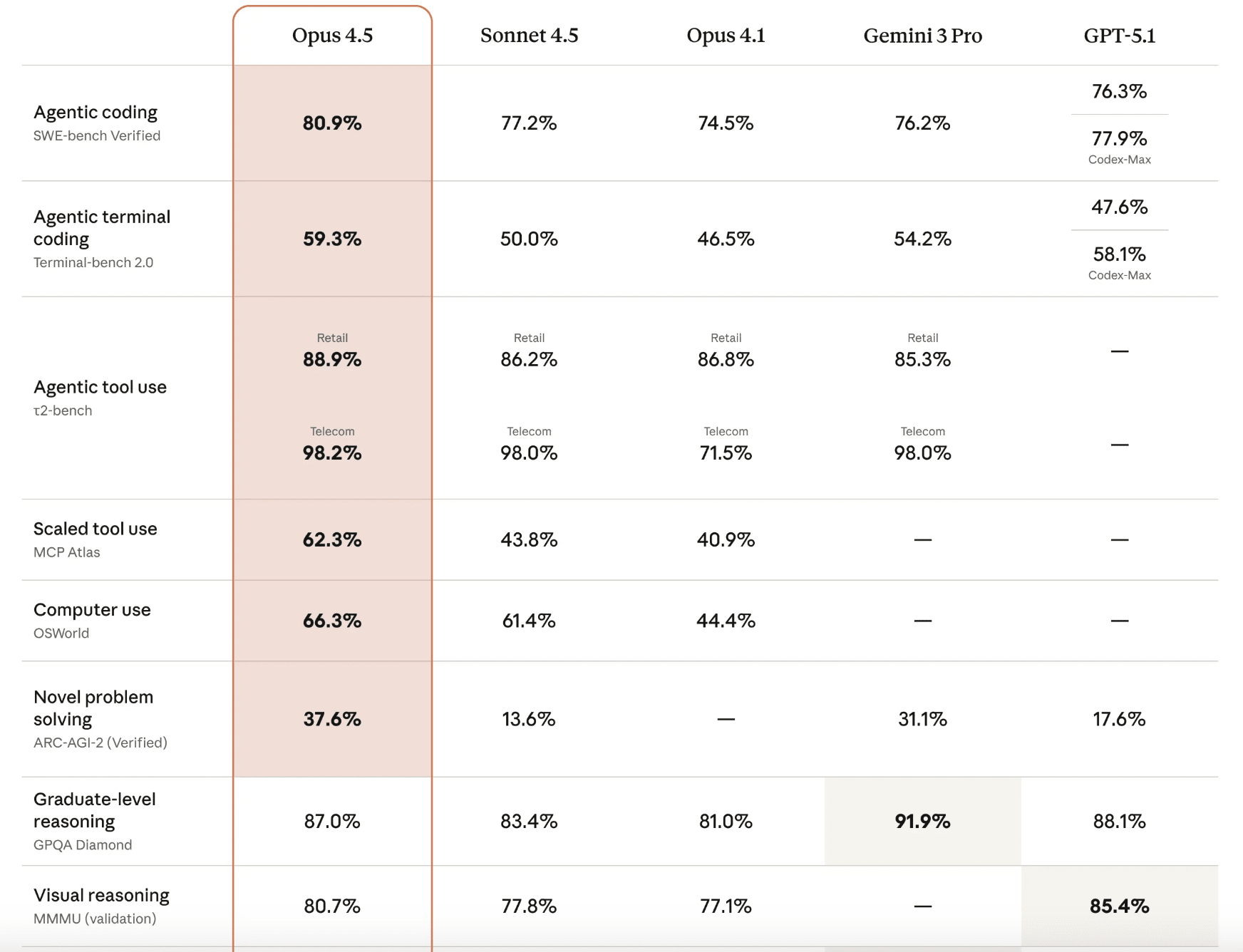 Looking at a blog post announcing Opus 4.5, we see a list of benchmarks measuring the model’s performance across Agentic terminal coding (Terminal-bench 2.0), Agentic tool use (τ²-Bench), Novel Problem Solving (Arc-AGI-2), and others.