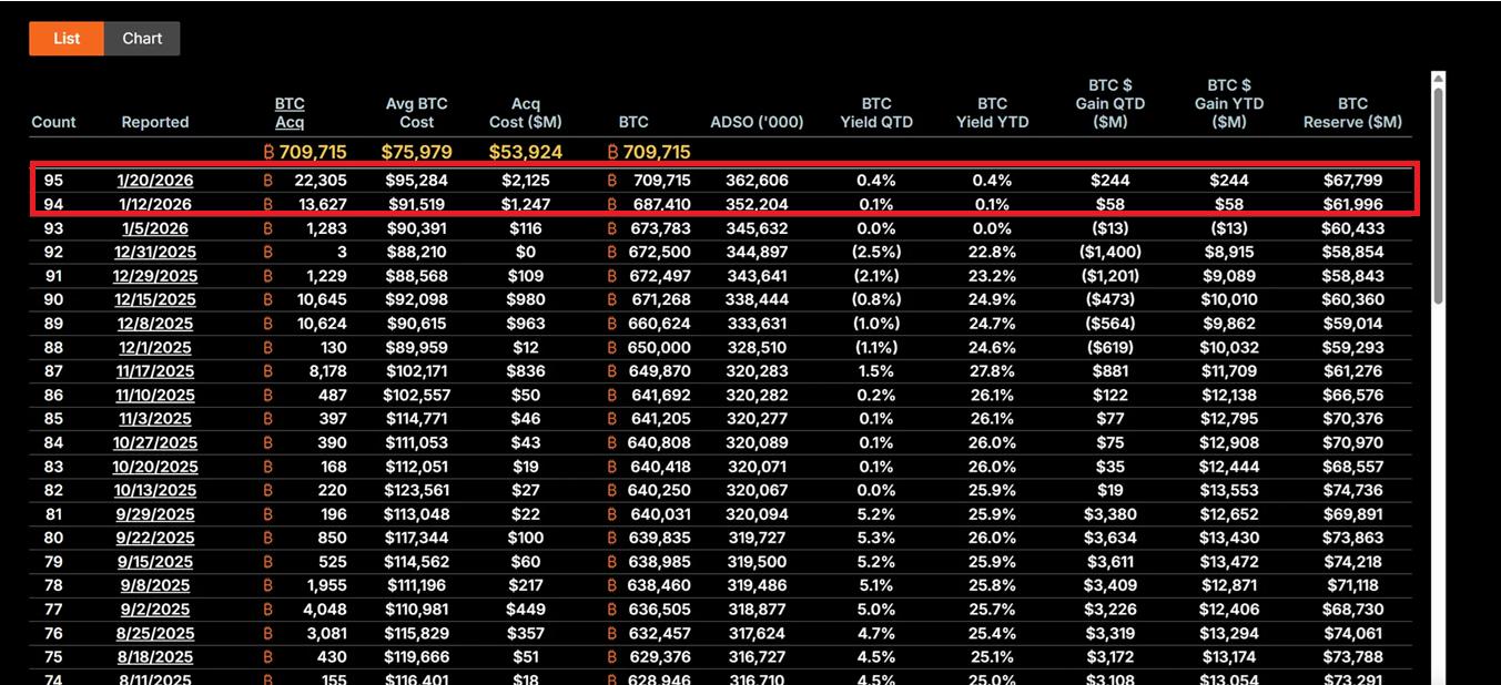 Under the leadership of CEO Michael Saylor, Strategy has fully transformed itself into a Bitcoin holding vehicle. Between January 12th and 19th, 2026, the company purchased 22,305 BTC at an average price of approximately $95,500, for a total value of $2.13 billion, marking its largest single purchase in the past nine months. As of now, MSTR holds a total of 709,715 Bitcoins, with an average cost of $75,979 and a total investment of nearly $53.92 billion.