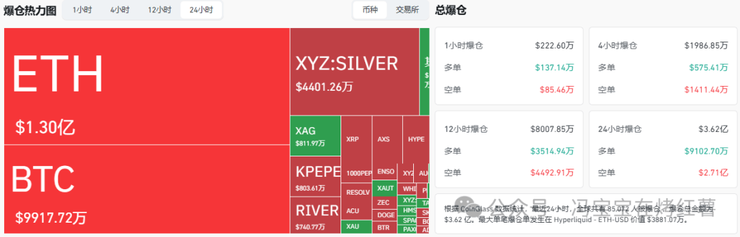 In the past 24 hours, a total of 85,072 people across the network have had their positions liquidated, with a total liquidation amount of $362 million. Long positions were liquidated for $91.027 million, and short positions were liquidated for $271 million.