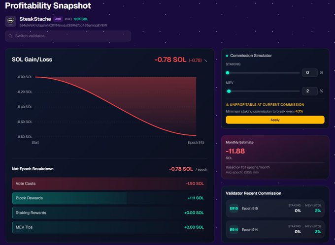 Smaller @solana validators are feeling the squeeze as vote coverage is gone for most and @SolanaFndn Delegation Program stake is dwindling. So I built this profitability dashboard with commission simulator: Enjoy! steakstache.com/profitability-...