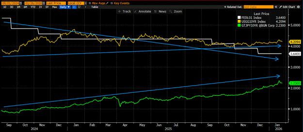 The Fed delivered 1.75% of cuts since it began easing in September 2024 (white line). Unfortunately for Buffalo Bill Bessent, the 10-yr treasury yield (yellow line) rose slightly instead of dropping faster than ICE protestors in Minnesota. Part of this is because of sticky inflation and partly due to supply issues. As 10-year and beyond JGB yields rise (green line), Japan Inc. invests more at home rather than abroad.