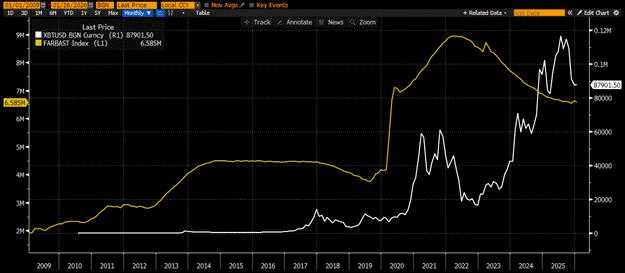 Bitcoin fell as the yen strengthened against the dollar. I will not increase risk before I confirm the Fed is printing money to intervene in the yen and JGB markets. If the Foreign Currency Denominated Assets line item on the Fed’s balance sheet rises w-o-w then it’s time to increase my holdings of Bitcoin. I stopped myself out of my long Strategy (MSTR US) and Metaplanet (3350 JP) trades before the yen moves thankfully. I will re-enter these levered Bitcoin proxies if my hypothesis is correct.