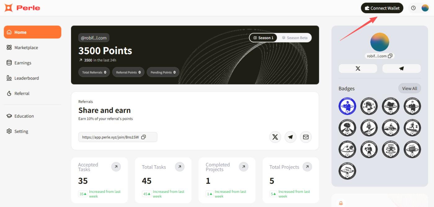 STEP 1. Go to the interactive link ( https://app.perle.xyz/ ), click "Connect Wallet", and the link will be a wallet that supports the Solana network (there will be a personal referral link, and you can get 10% of the points earned by your friends). Make sure that your logged-in wallet has a small amount of SOL, and each task needs to be confirmed on the blockchain.