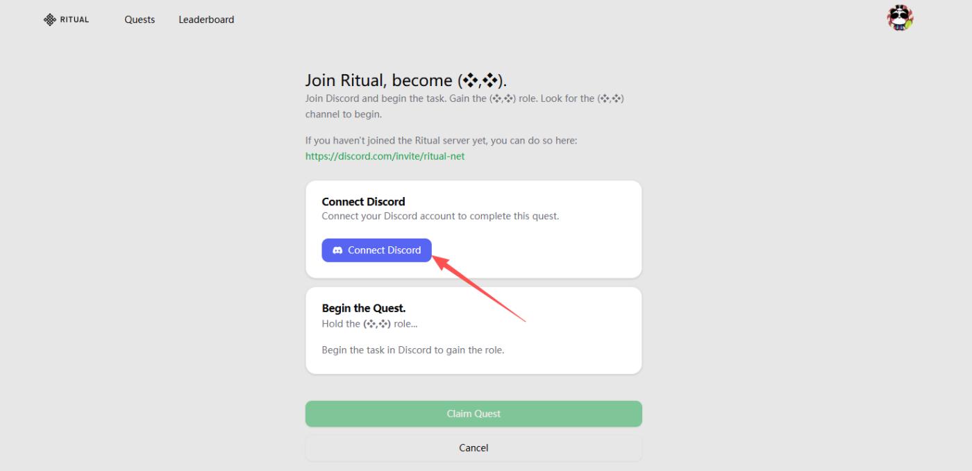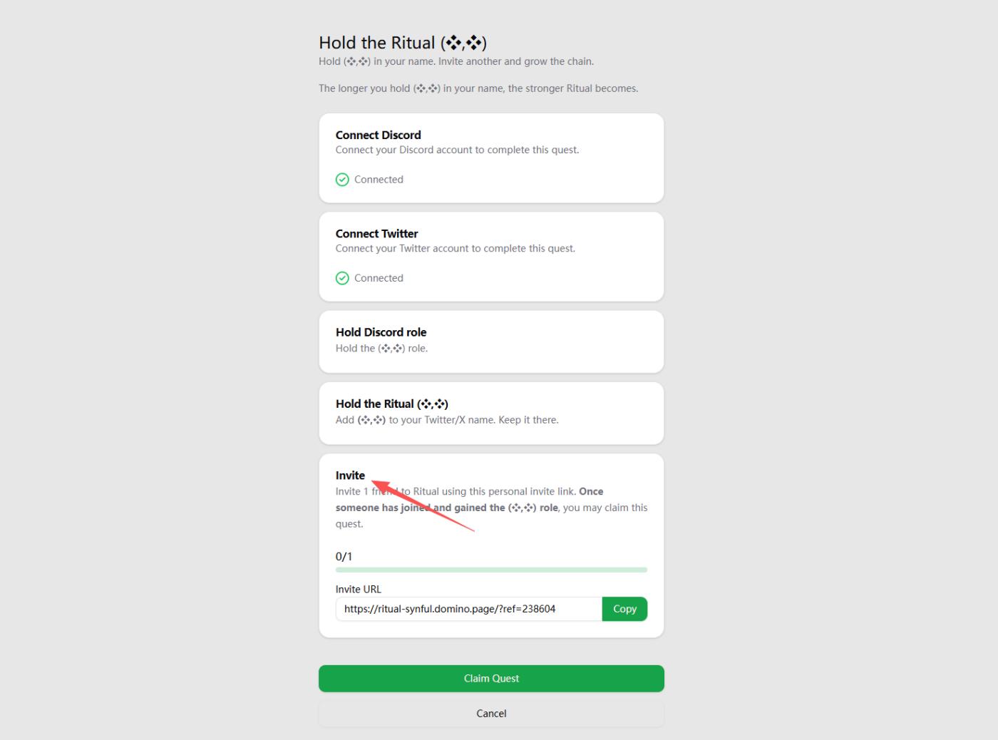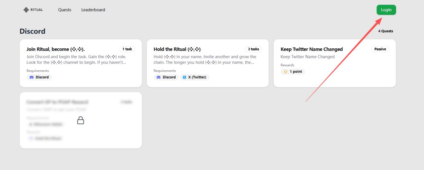 STEP 1. Go to the interactive website (link: https://ritual-synful.domino.page/quests ), click Login in the upper right corner, and log in with your X account.