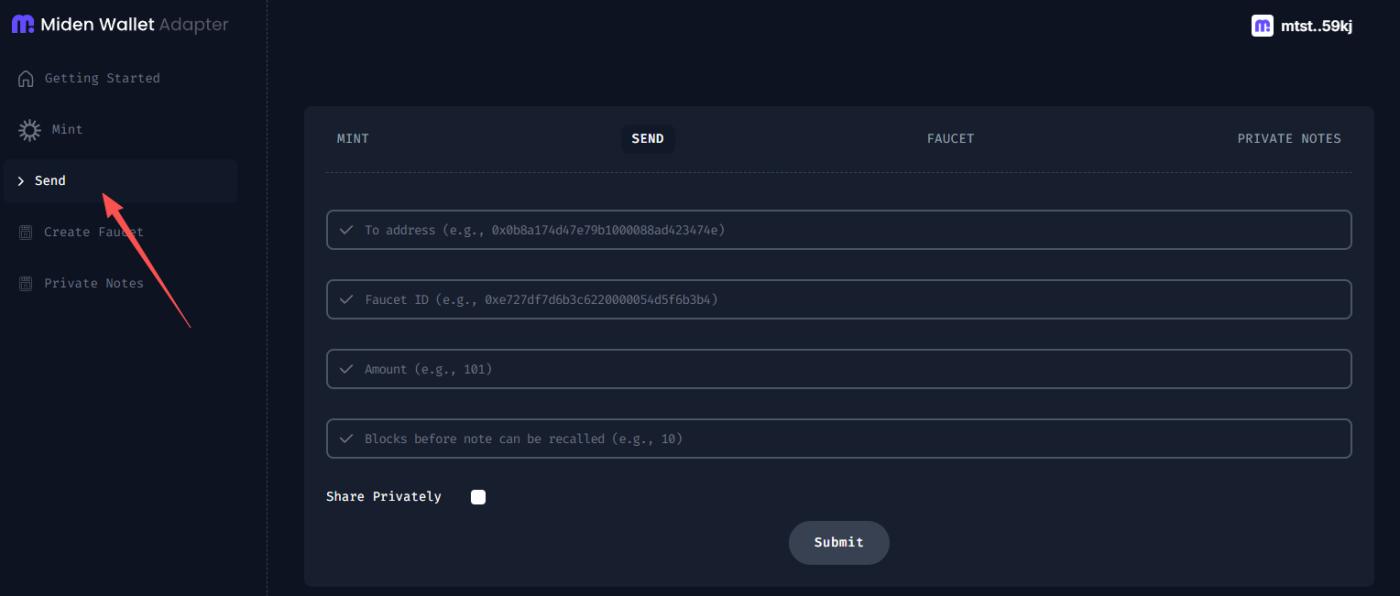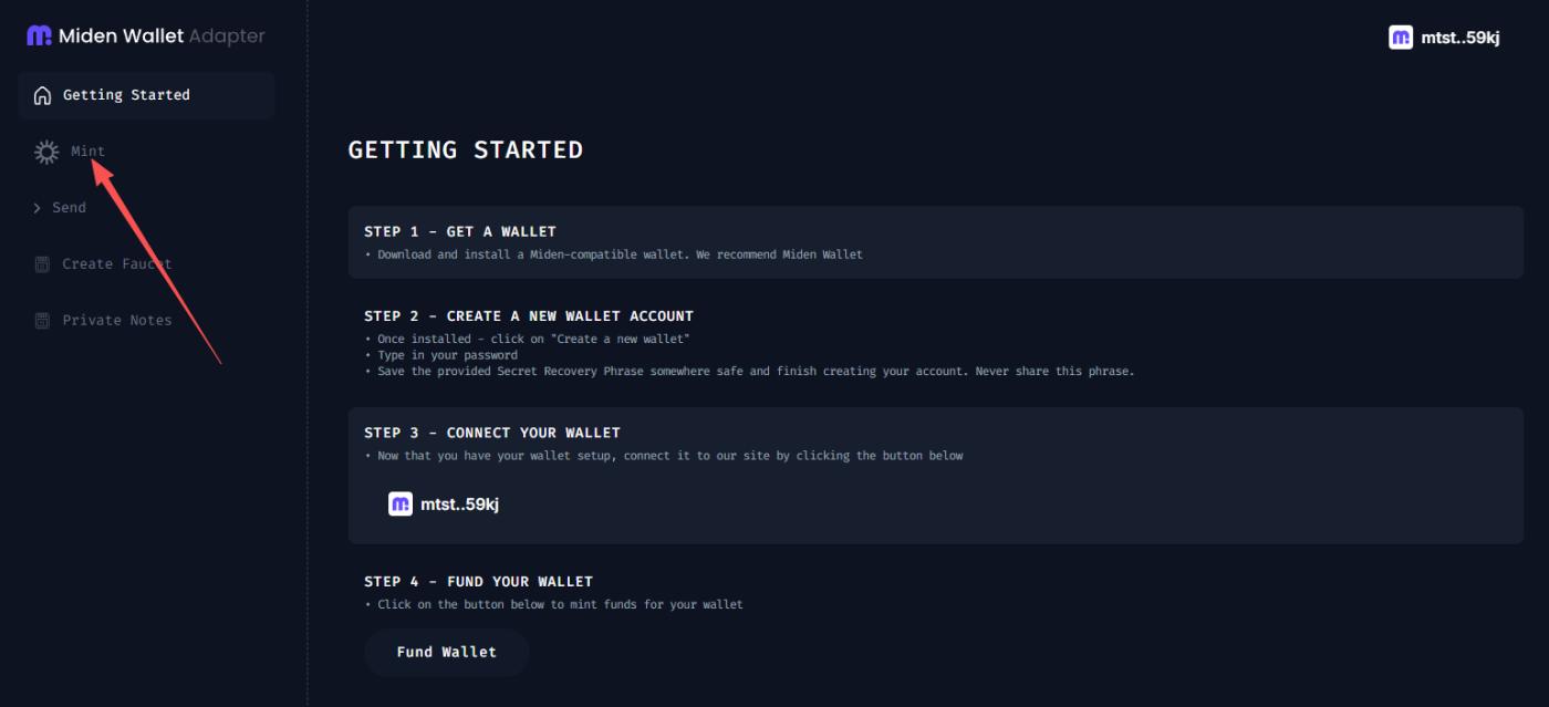STEP 2. Go to the interactive website (link: https://miden.leo.app/ ), connect to the address you just registered using the Miden Wallet plugin, and click "Mint" in the left sidebar to claim 100 test coins.