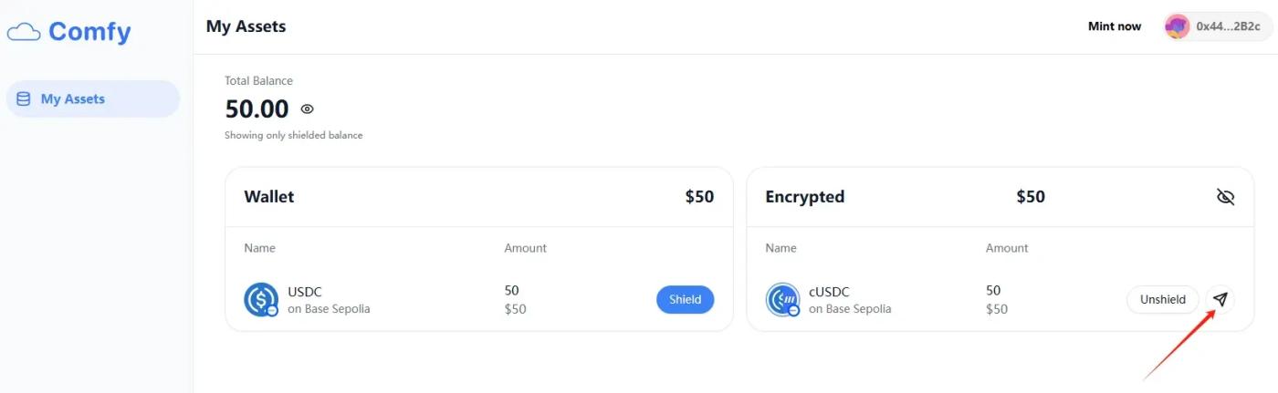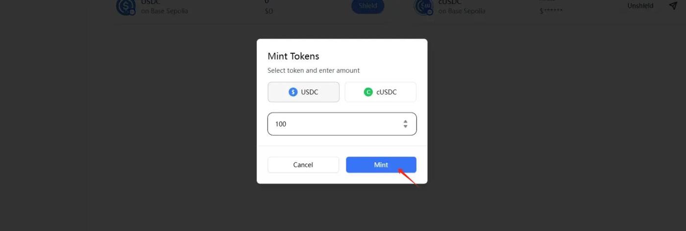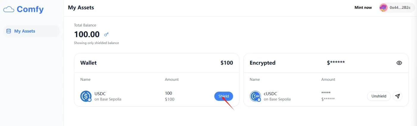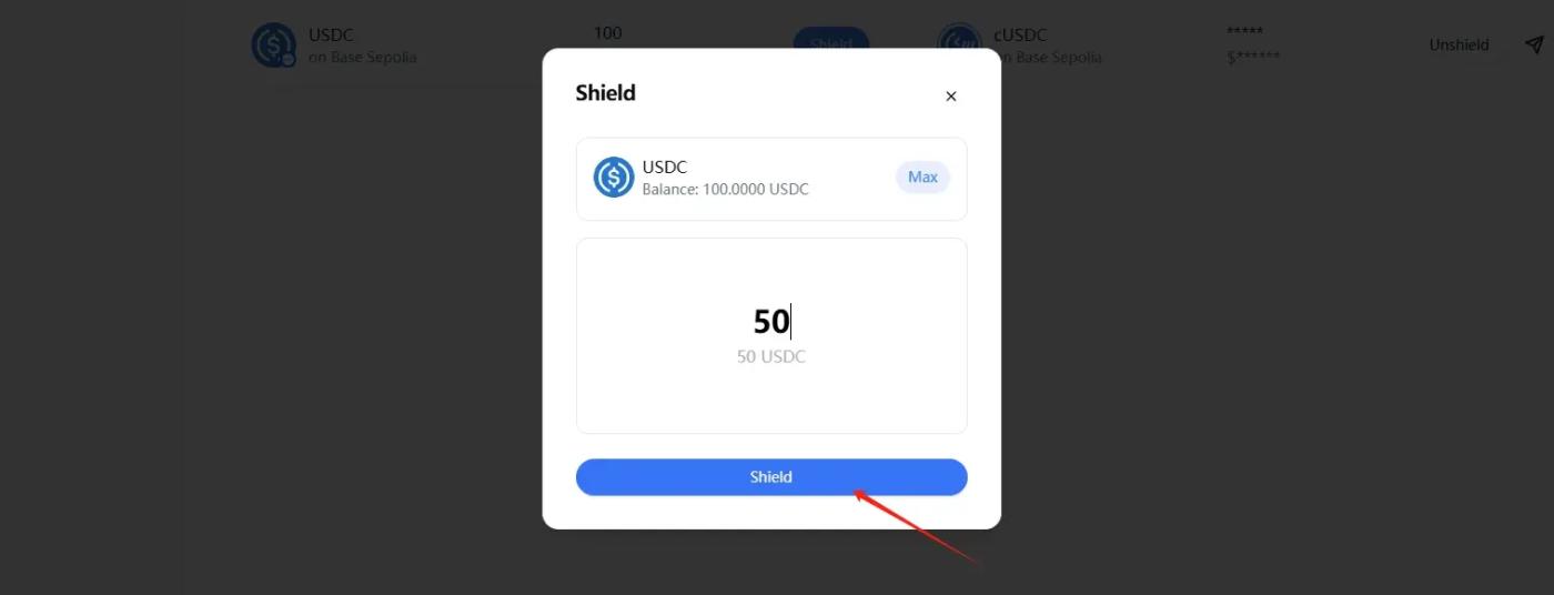 STEP 4. Select “Shield” to exchange a portion of USDC for cUSDC, then click “Unshield” to exchange a portion of cUSDC for USDC.