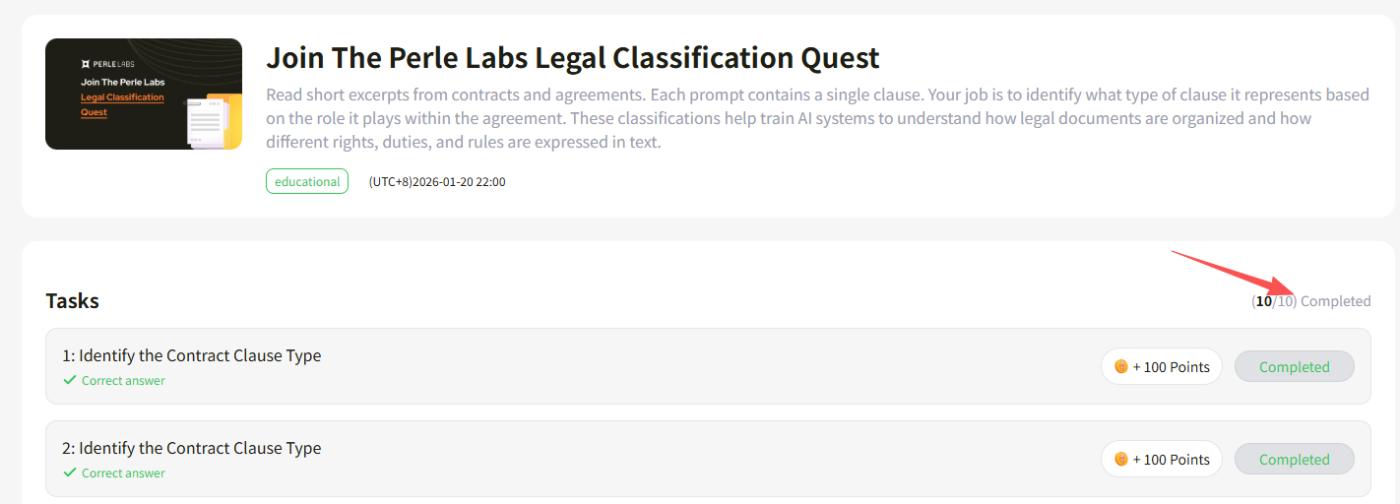 Task 1. Join The Perle Labs Legal Classification Quest. Read excerpts from legal contracts and select the corresponding clauses (the questions are too technical; it is recommended to use AI tools to assist in completing them). There are 10 questions in total, each worth 100 points, for a total of 1000 points.