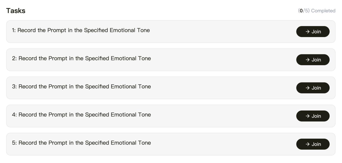 Task 6. Join The Perle Labs Emotional Speech Recording Quest. Record your speech in the specified tone (in English). There are 5 questions, each worth 100 points, for a total of 500 points.