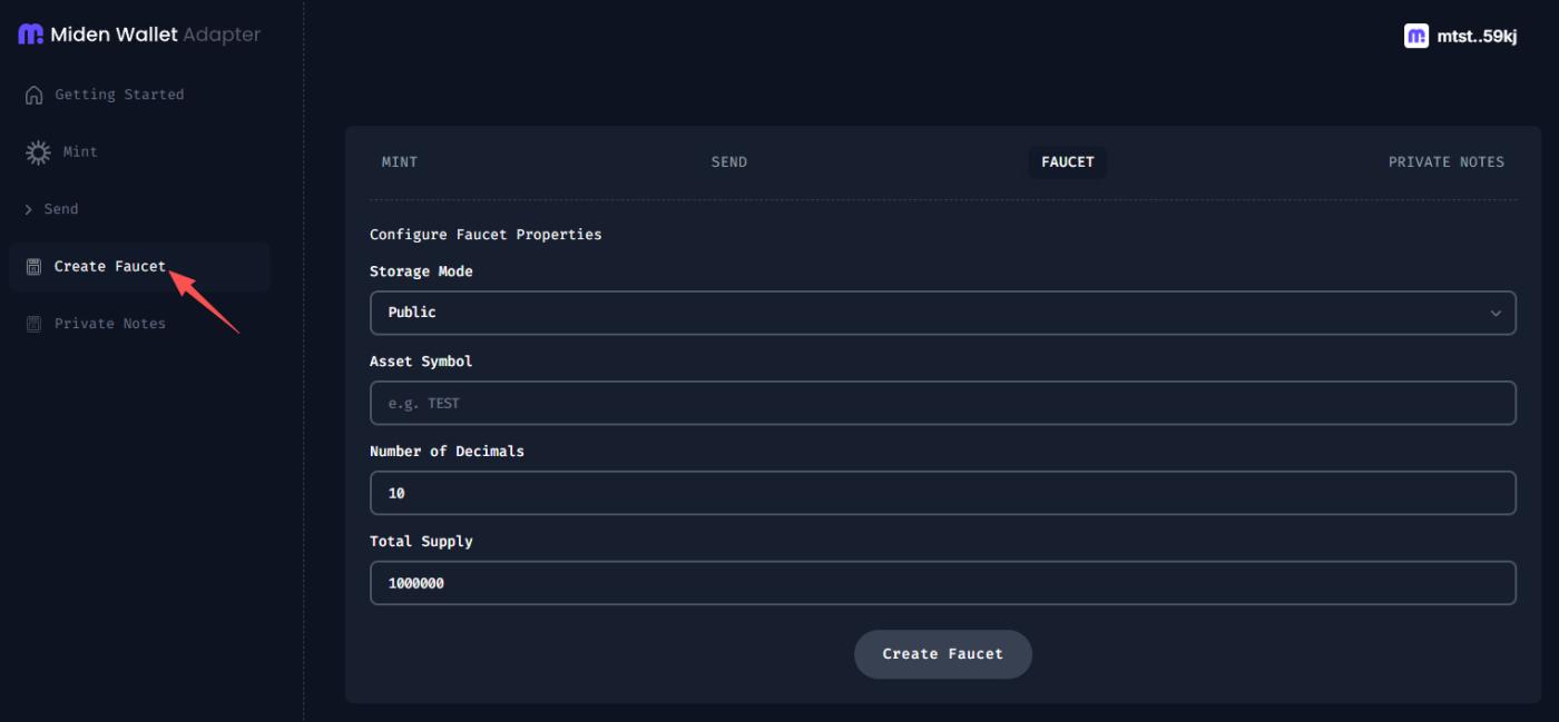 STEP 4. Click “Create Faucet” in the left sidebar, select Public or Private for Storage Mode (you can also interact with each one once), and enter any token symbol for Asset Symbol.