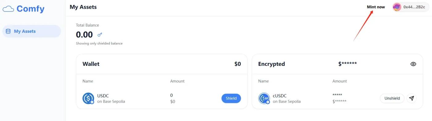 STEP 3. After entering the Comfy project interaction website (link: https://comfy.inco.org/ ), click "Connect Wallet" and then select "Mint now" to access Mint USDC.