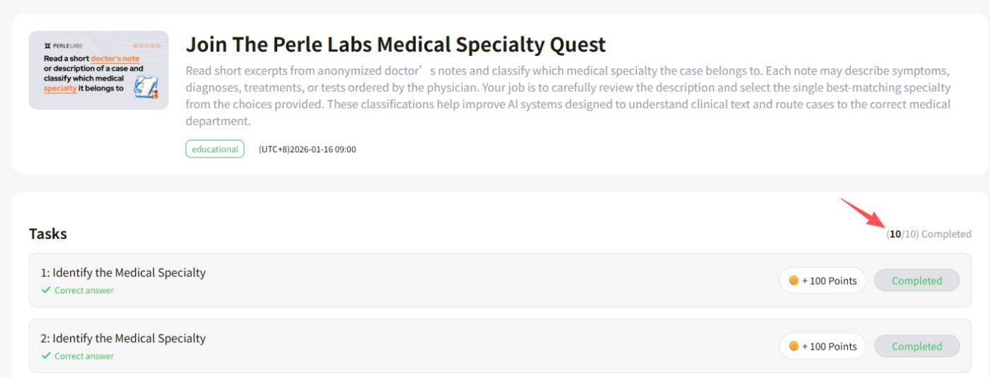 Task 5. Join The Perle Labs Medical Specialty Quest. Read the doctor's notes to determine the medical specialty of the case (the questions are too technical, it is recommended to use AI tools to assist in completing them). There are 10 questions in total, 100 points for each question, and a total of 1000 points.