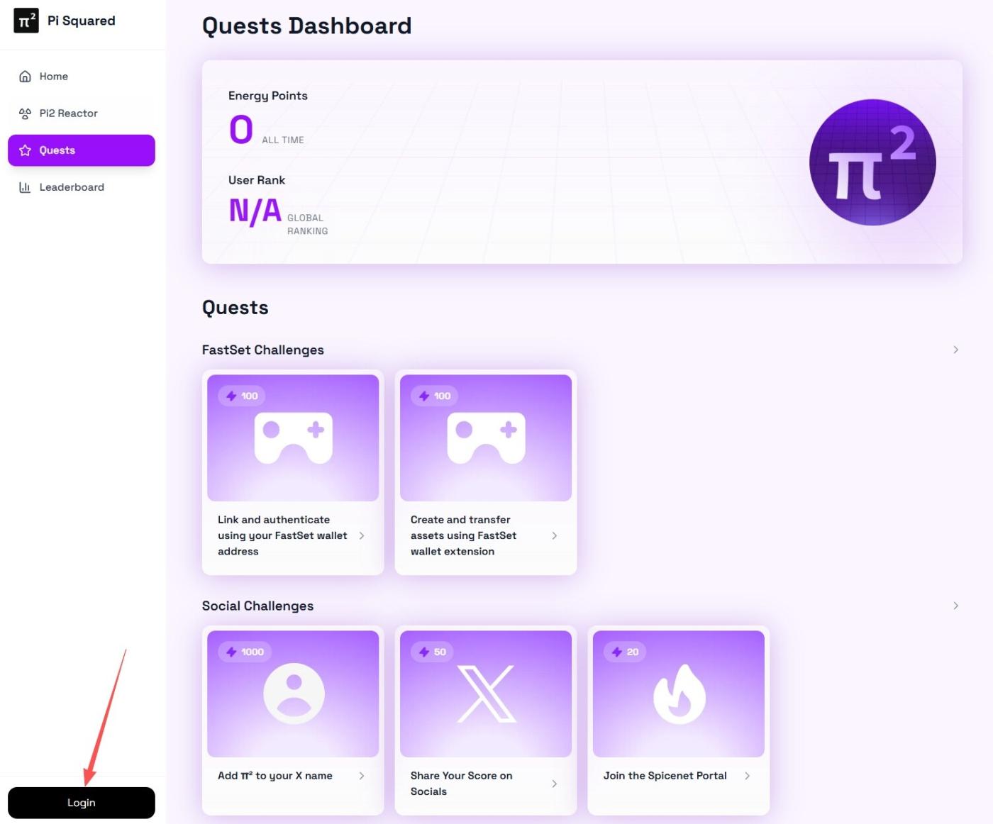 STEP 2. Go to the interactive website (link: https://portal.pi2.network/quests ), click "Login" in the lower left corner of the Pi Squared page, log in with your Gmail, and then link your X account, Discord, and wallet.