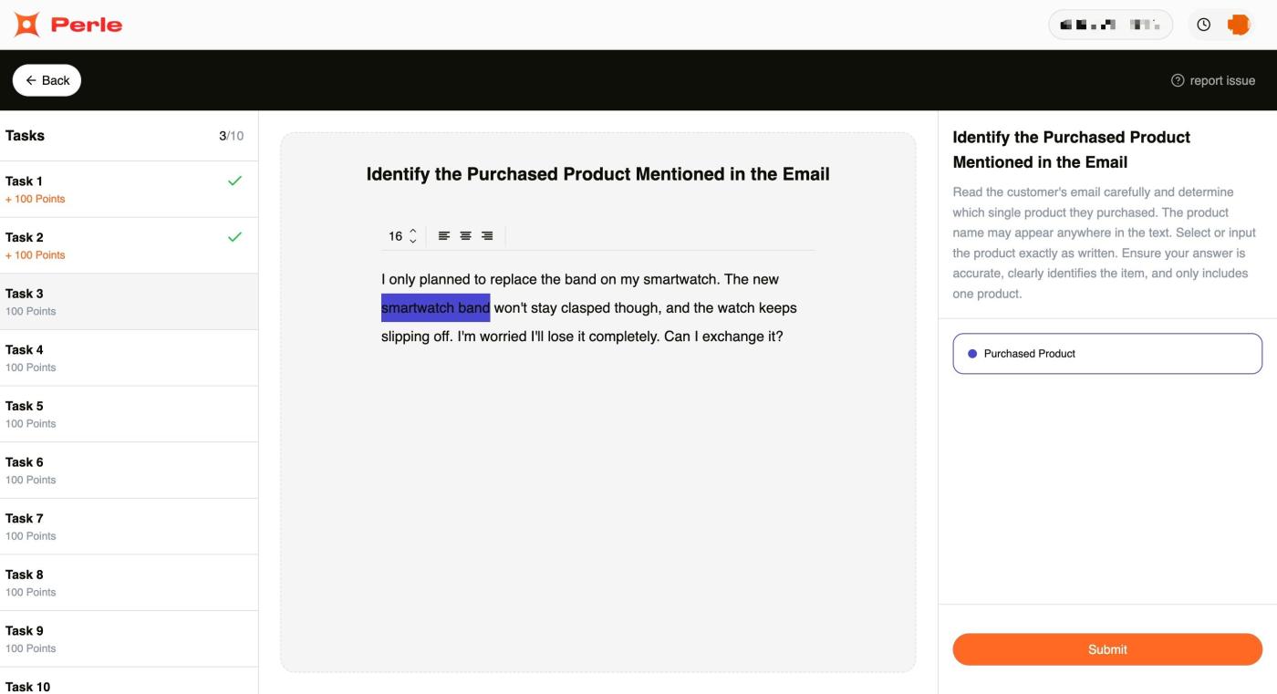 Task 3. Join The Perle Labs Product Tagging Quest. Find the products mentioned in the complaint emails. There are 10 questions in total, each worth 100 points, for a total of 1000 points.