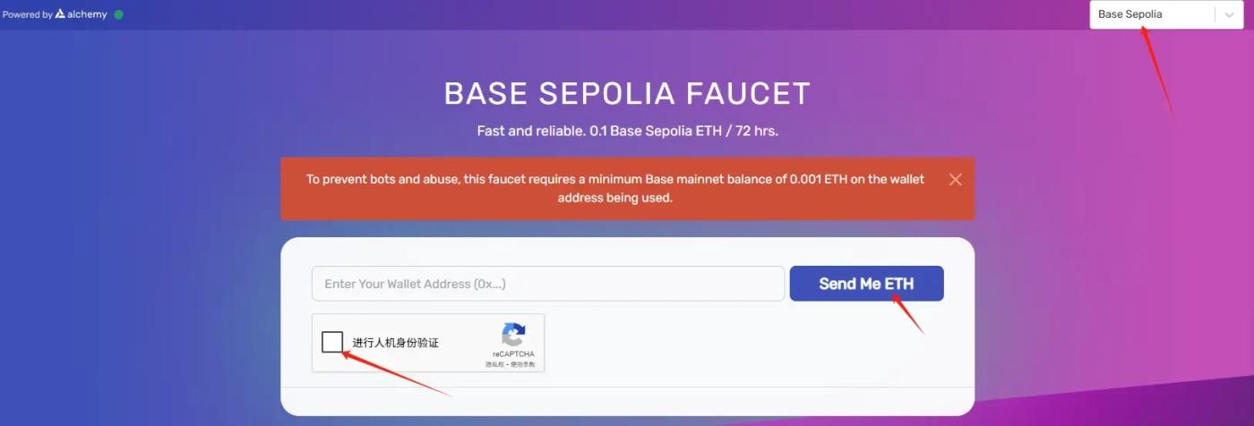 STEP 1. Go to the website to claim test tokens (link: https://www.alchemy.com/faucets/base-sepolia ), select the "Base Sepolia" test network, complete the human verification, and enter your address to claim the test tokens ETH (you need to have 0.001 ETH in your wallet on the Base mainnet to claim).