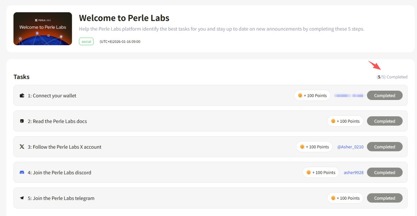 Task 2. Welcome to Perle Labs. Link your personal account to X, Discrod, Telegram, etc. There are 5 tasks in total, each worth 100 points, for a total of 500 points.