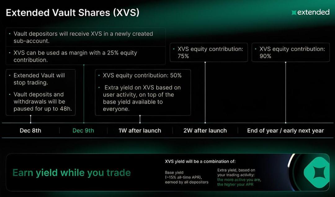 One of Extended's differentiating advantages lies in its vault system—which allows traders to earn returns while trading perpetual contracts. Through "Extended Vault Shares (XVS)," depositors can earn a base annualized yield (APR) of approximately 15%, in addition to "additional earnings" based on trading activity.