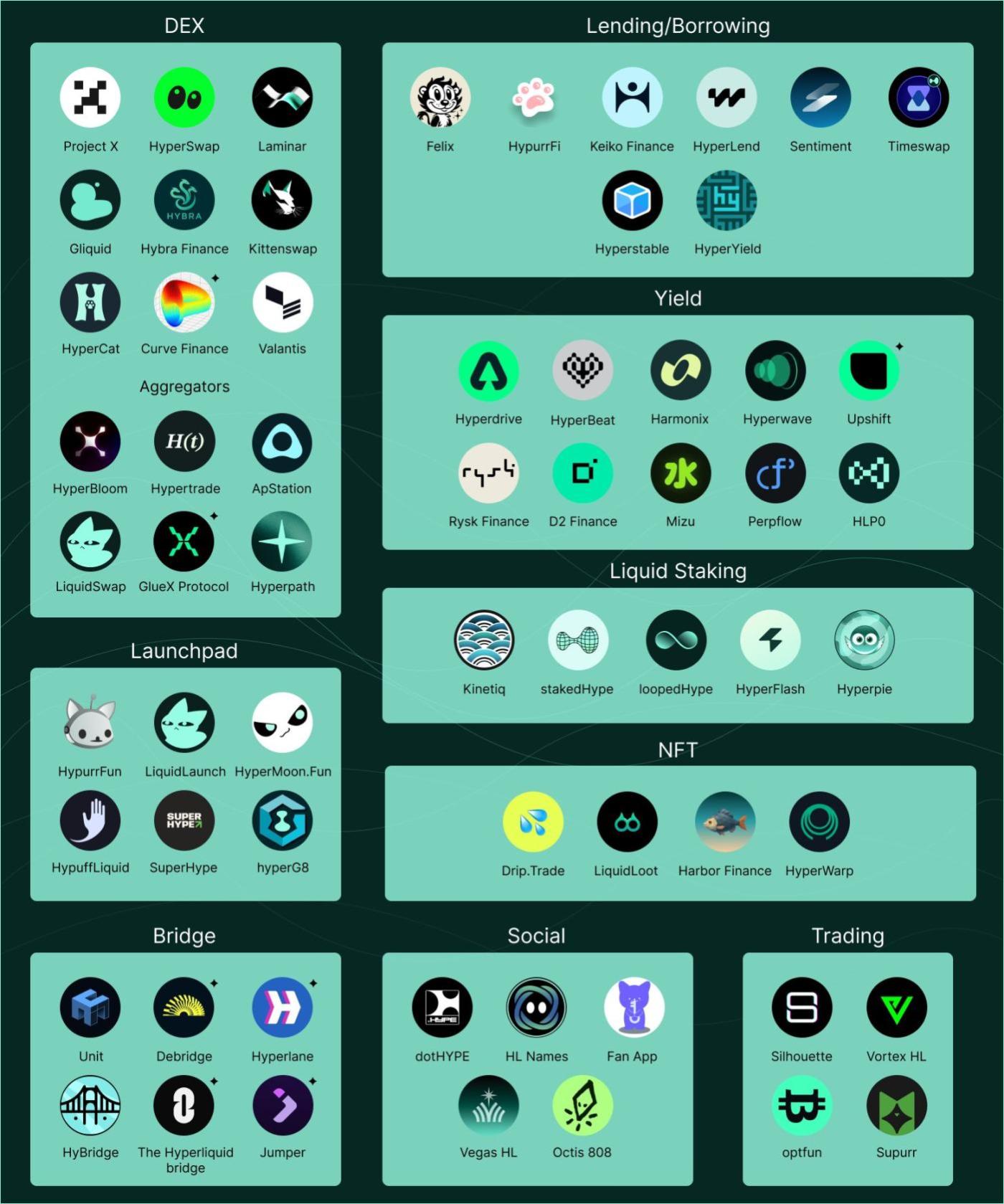 The HyperEVM ecosystem has attracted a number of core protocols covering areas such as lending, derivatives, yield aggregation, and infrastructure.